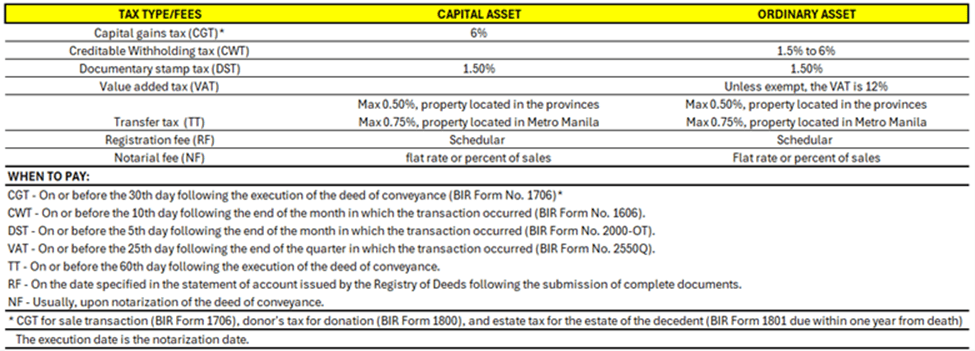 Because tax is a significant amount in a sale transaction, this is always considered in determining the selling price. The tax to be paid depends on the classification of real property.  Real property is classified either as capital asset or ordinary asset.