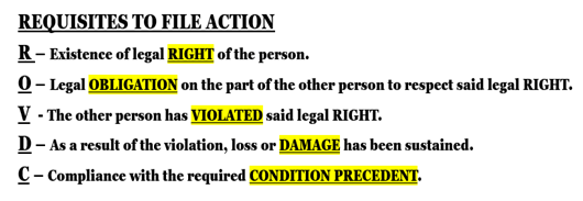 In responding to the query, I shared these requisites to file action in mnemonic presentation, ROVDC, as a guide. All the requisites must be present so an action may prosper provided prescription or estoppel is absent.