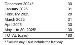 Following the Supreme Court computation of prescription from the finality of judgment in Abello v. Banco Filipino Savings and Mortgage Bank, G.R. No. 232706 Notice, July 18, 2022, the correct end of the contract is not May 31, 2025 but May 30, 2025, computed as follows (6 months x 30 days = 180 days):
